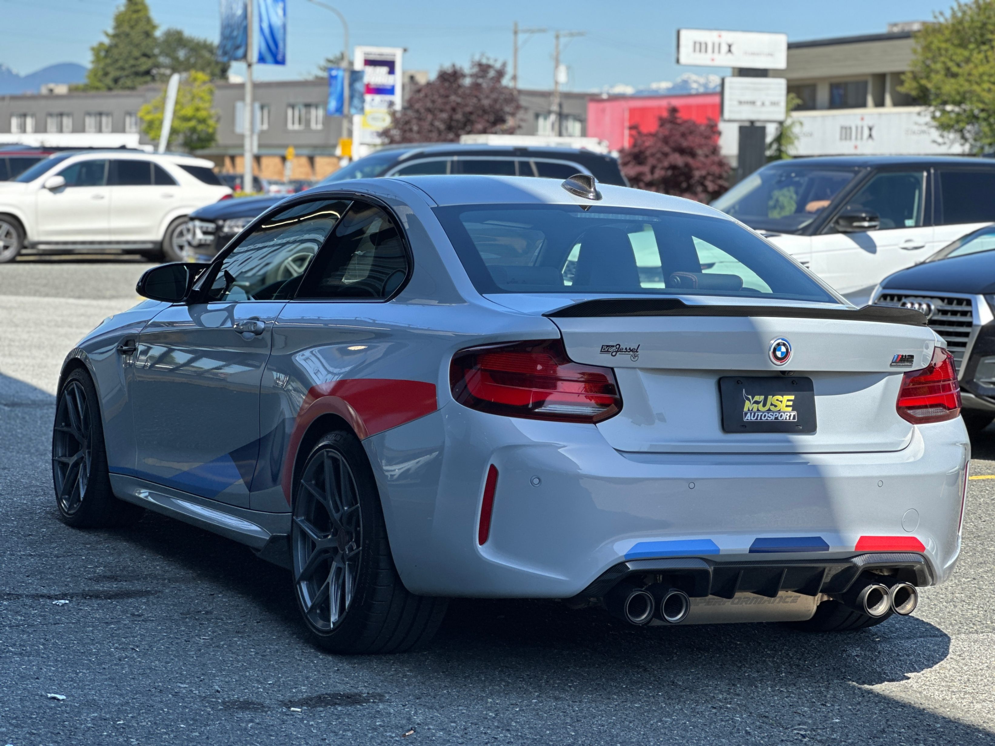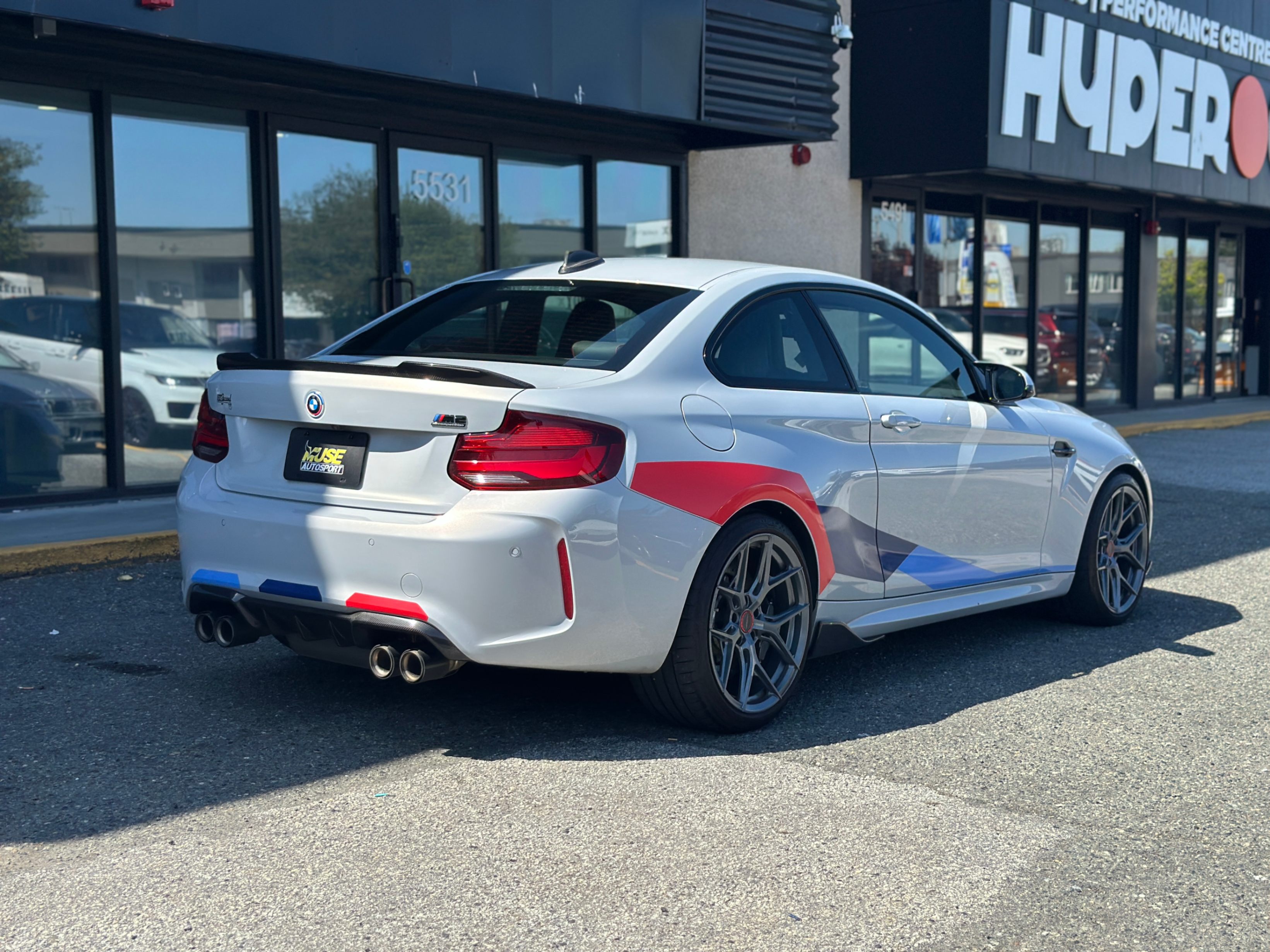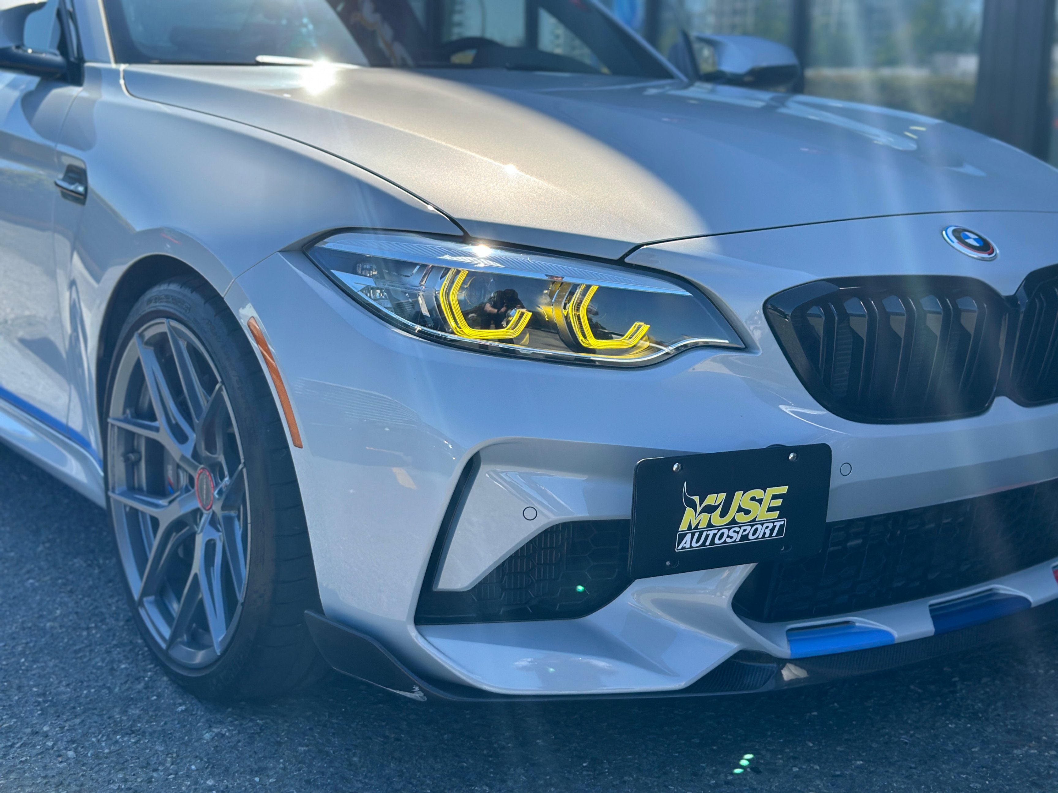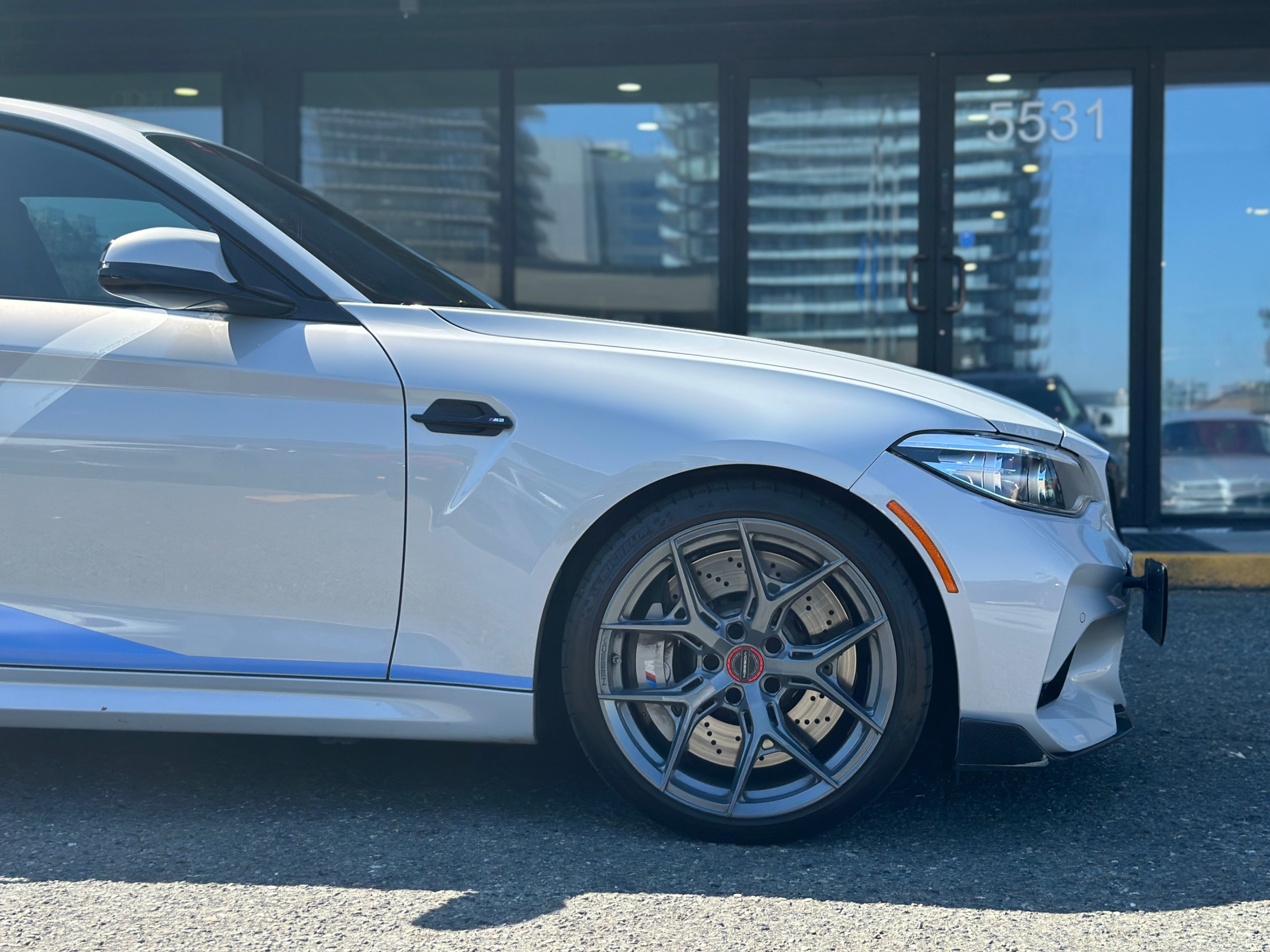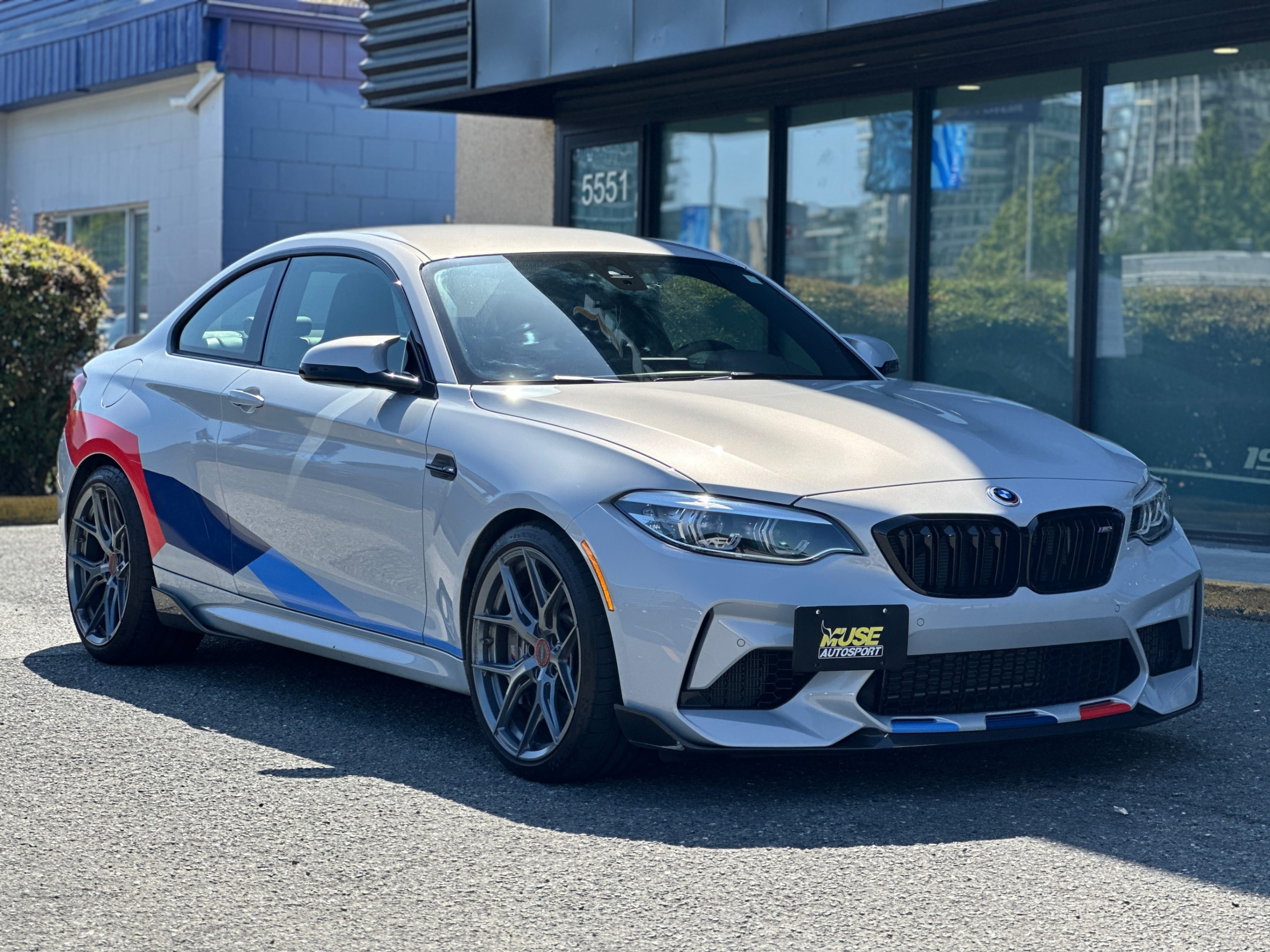 Our 2021 BMW M2 Competition is equipped with upgraded Vossen Hybrid Forged wheels, M-Performance factory titanium exhaust system, and carbon fiber aero kits; factory rims are included.