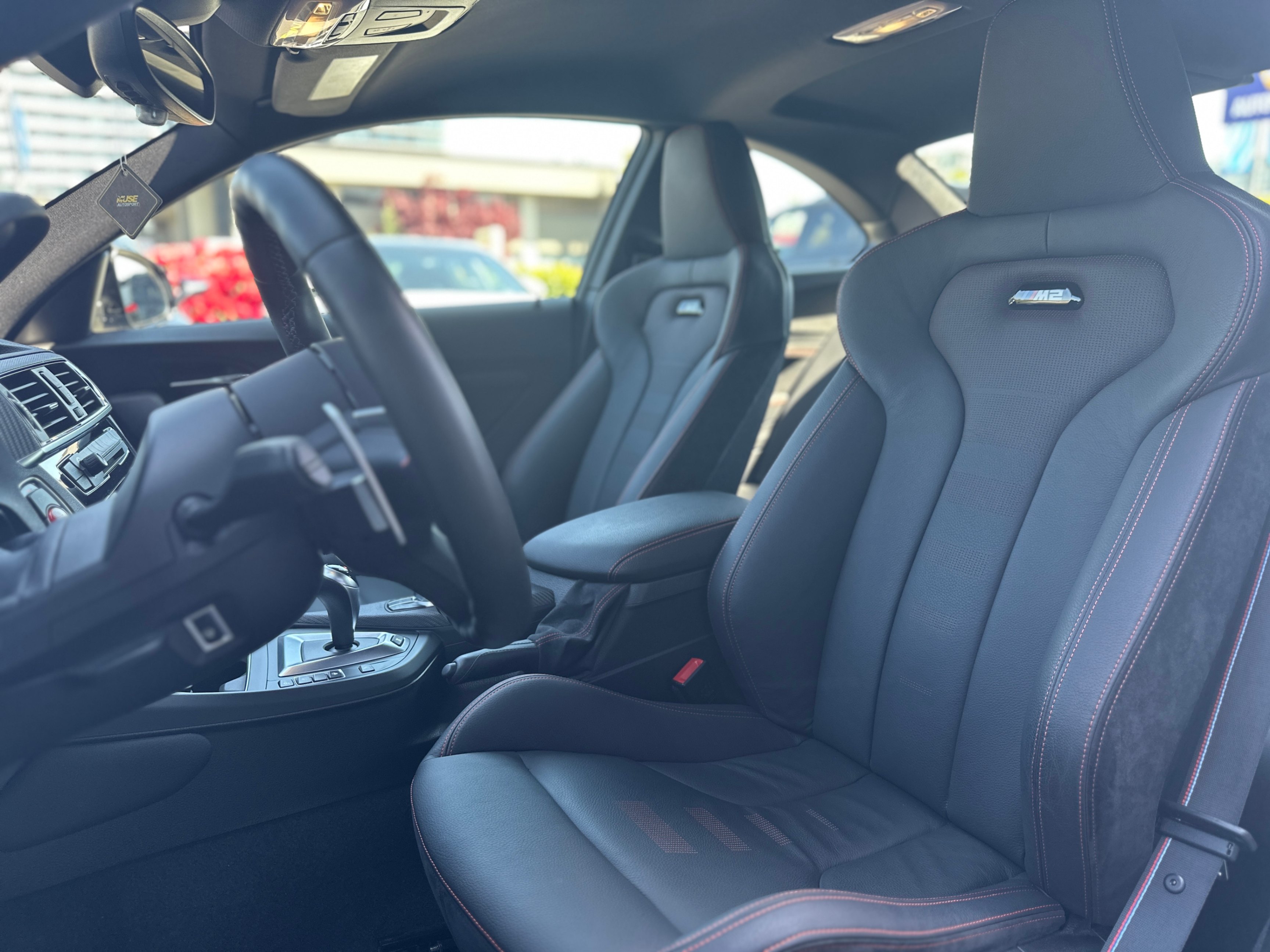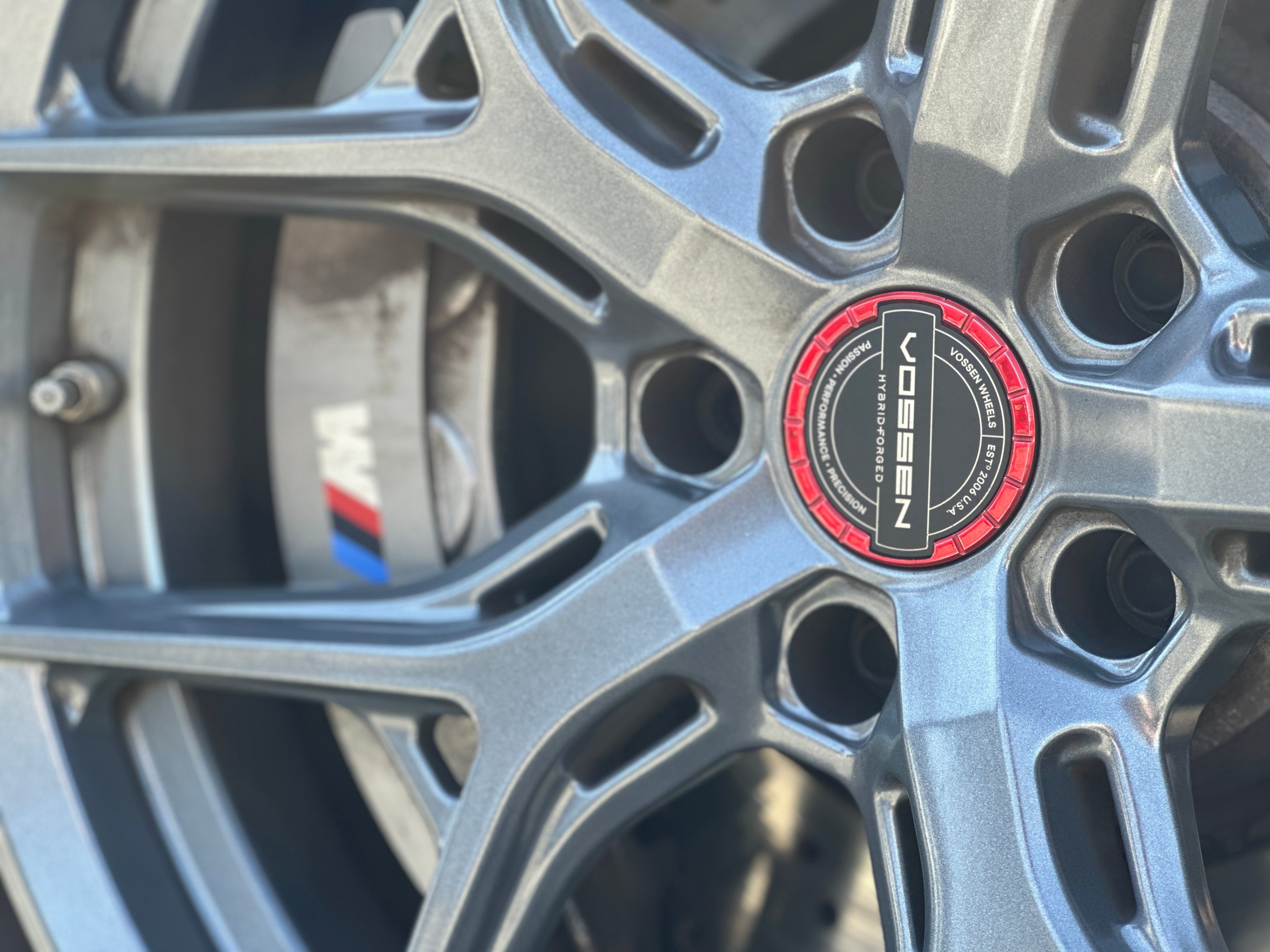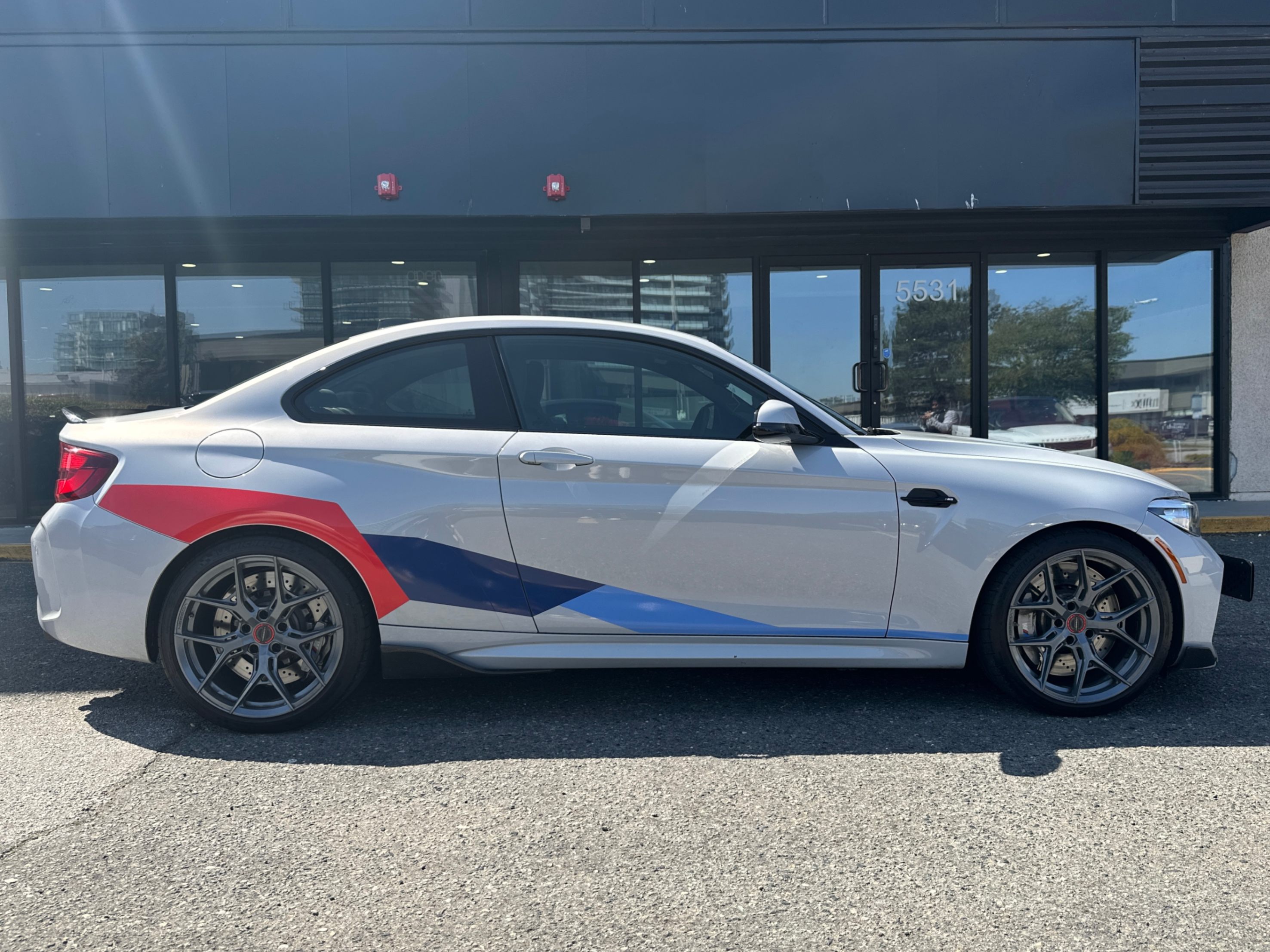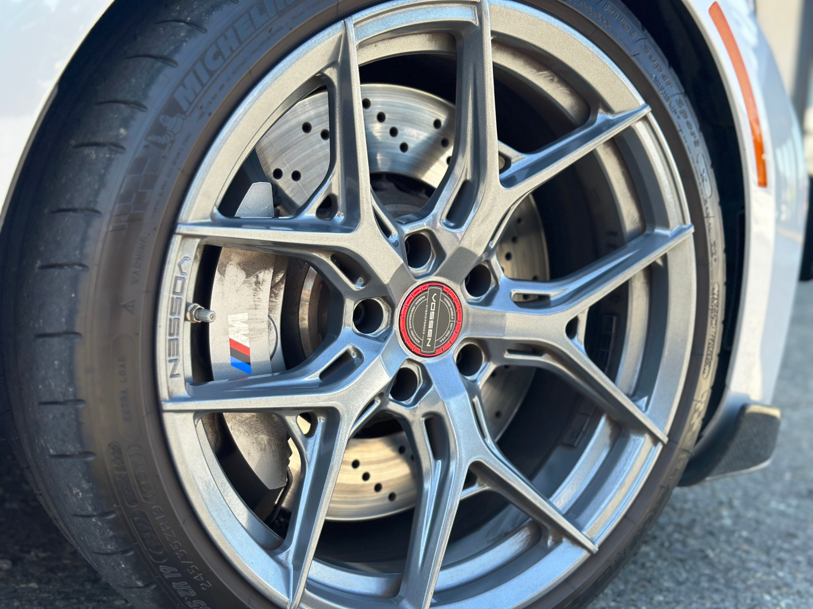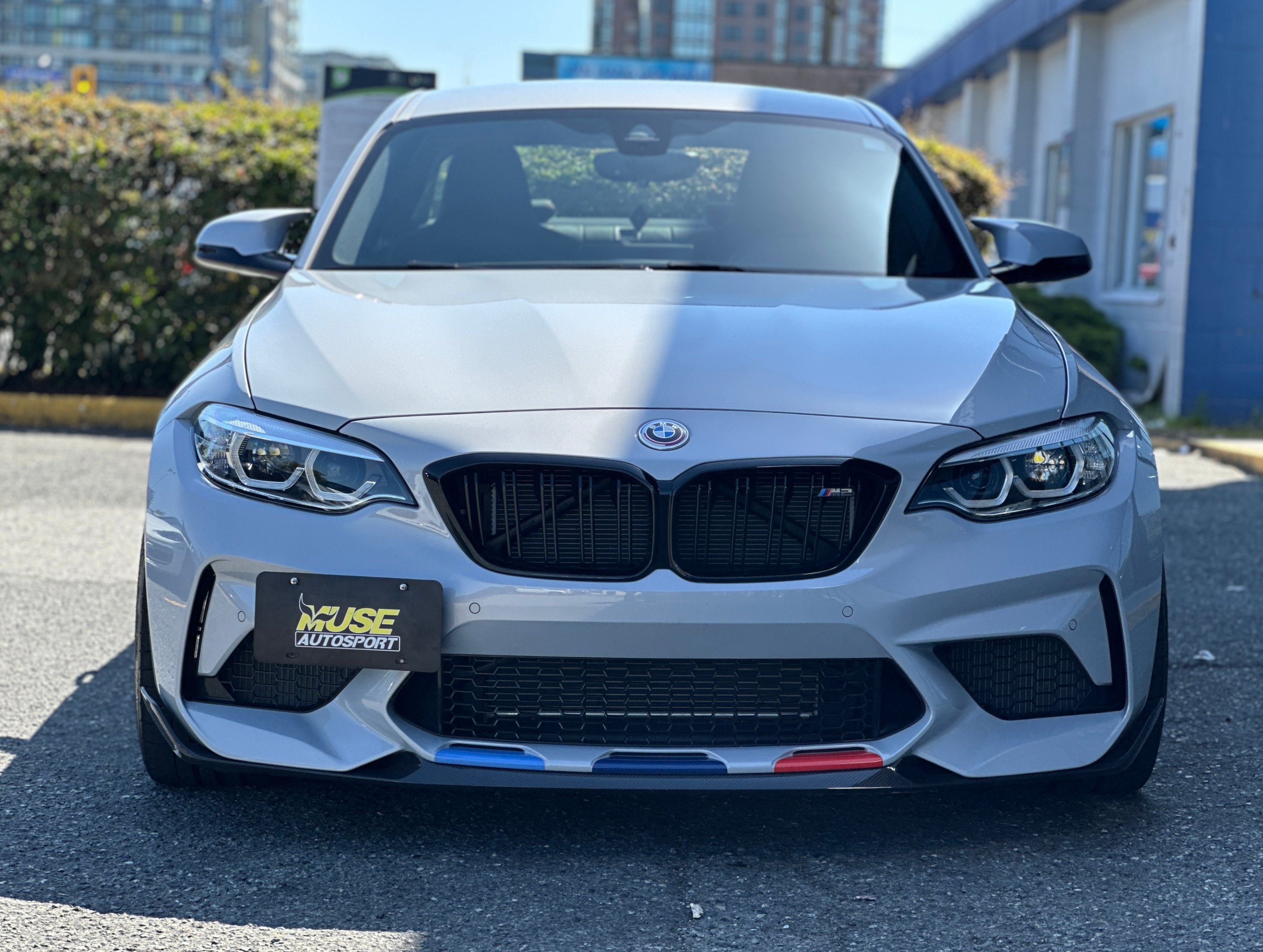 Our 2021 BMW M2 Competition is equipped with upgraded Vossen Hybrid Forged wheels, M-Performance factory titanium exhaust system, and carbon fiber aero kits; factory rims are included.