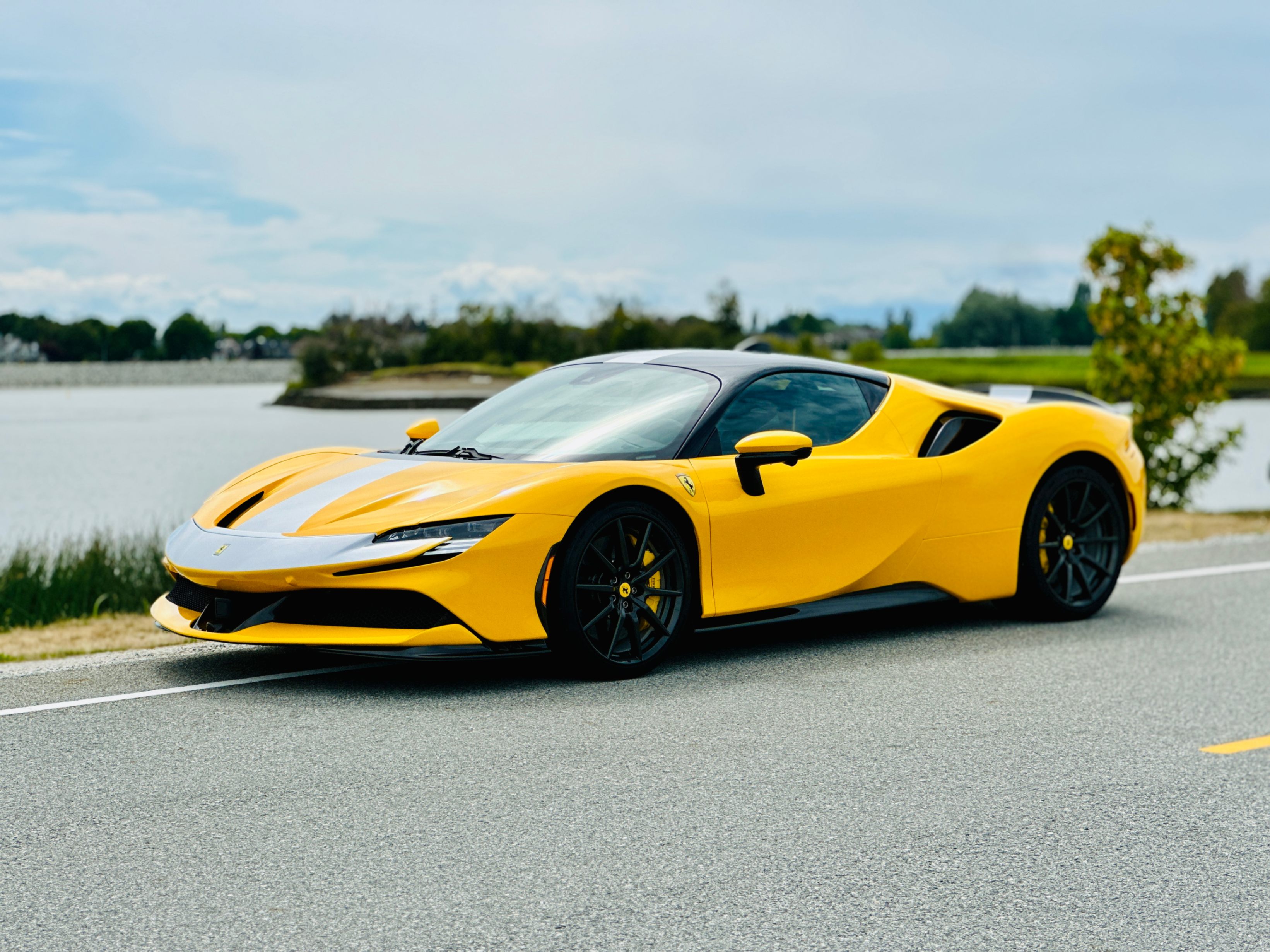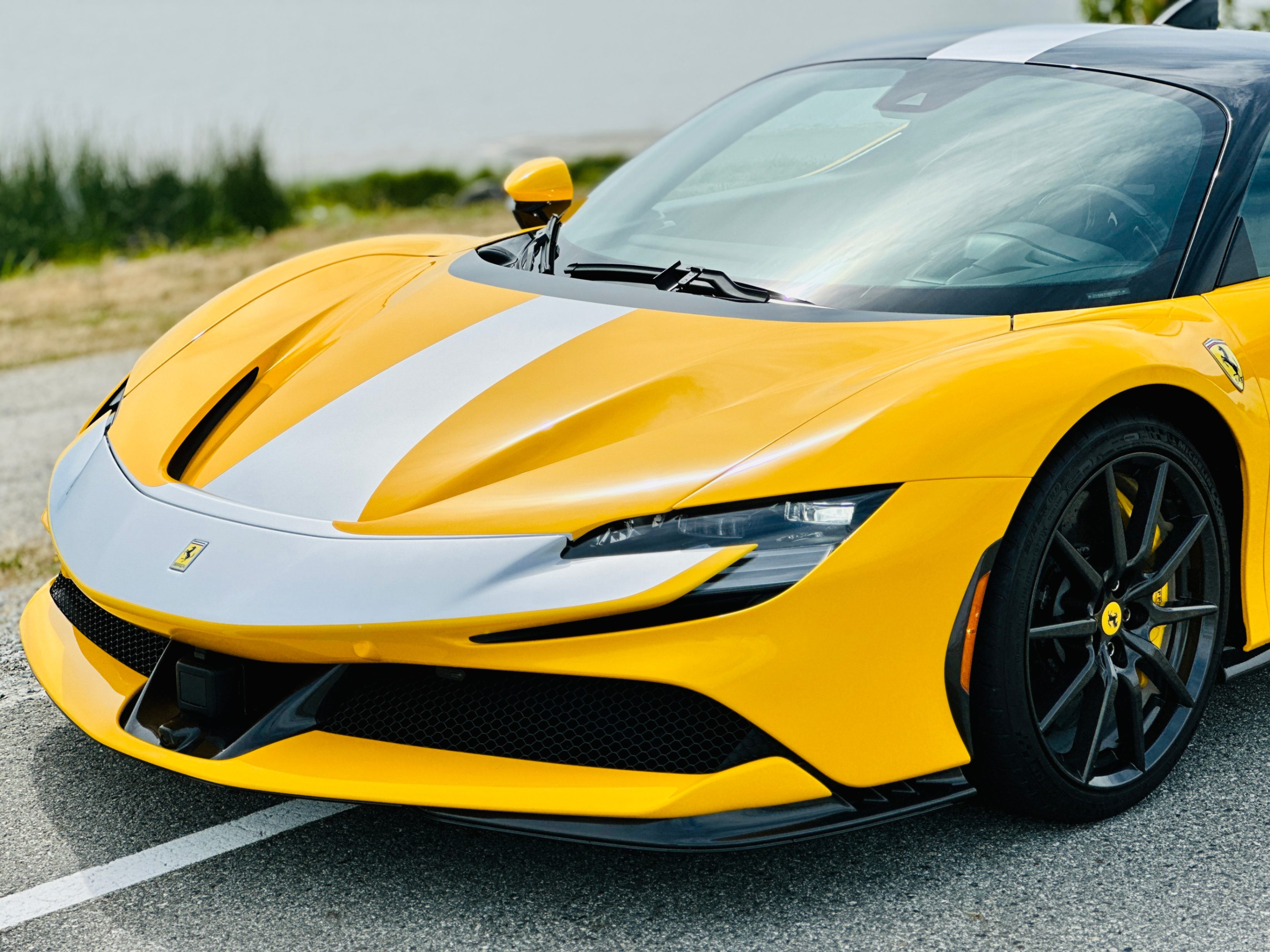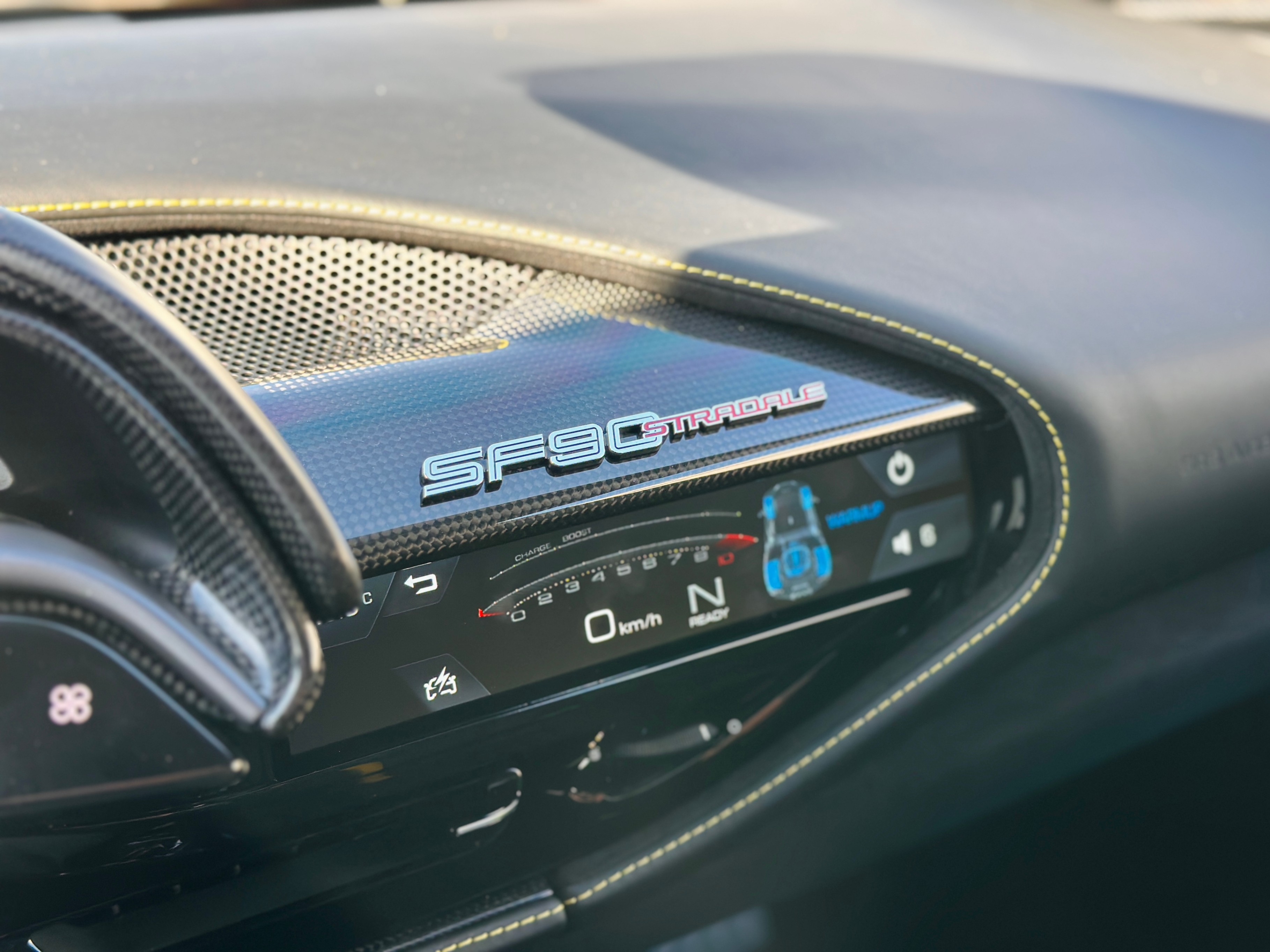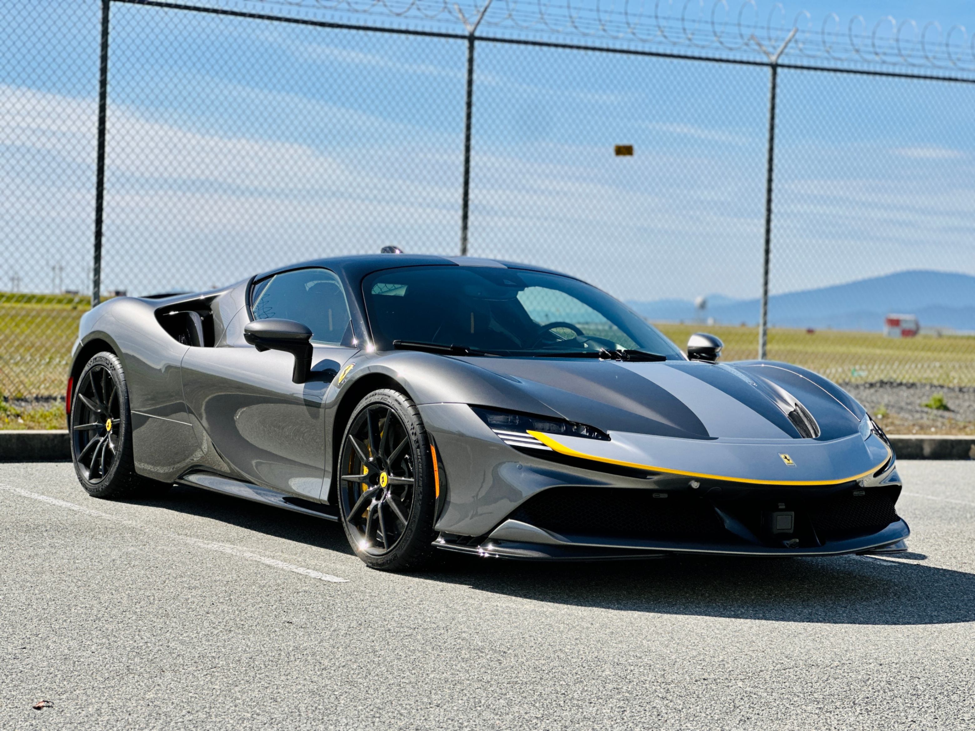 With the SF90, power comes from a massive V-8 and three electric motors. The 4.0-litre twin-turbocharged V-8 generates a mighty 769 horsepower on its own, and the trio of electric motors provide an additional 217 horsepower. In the end, the gas/electric powertrain generates a net output of 986 horsepower and 590 lb-ft of torque. Power is sent to all four wheels, making this the first mid-engined Ferrari with all-wheel drive. An eight-speed automatic transmission oversees the proceedings. As you’d expect, all that power under the hood translates into blistering acceleration. Ferrari estimates that this car will do 0-60 in low two seconds. It has multiple different driving modes which allow you to tailor the car’s handling to suit your preferences. The lineup includes EV Only, Hybrid, Performance, and Qualify, which absolutely unleashes the beast.