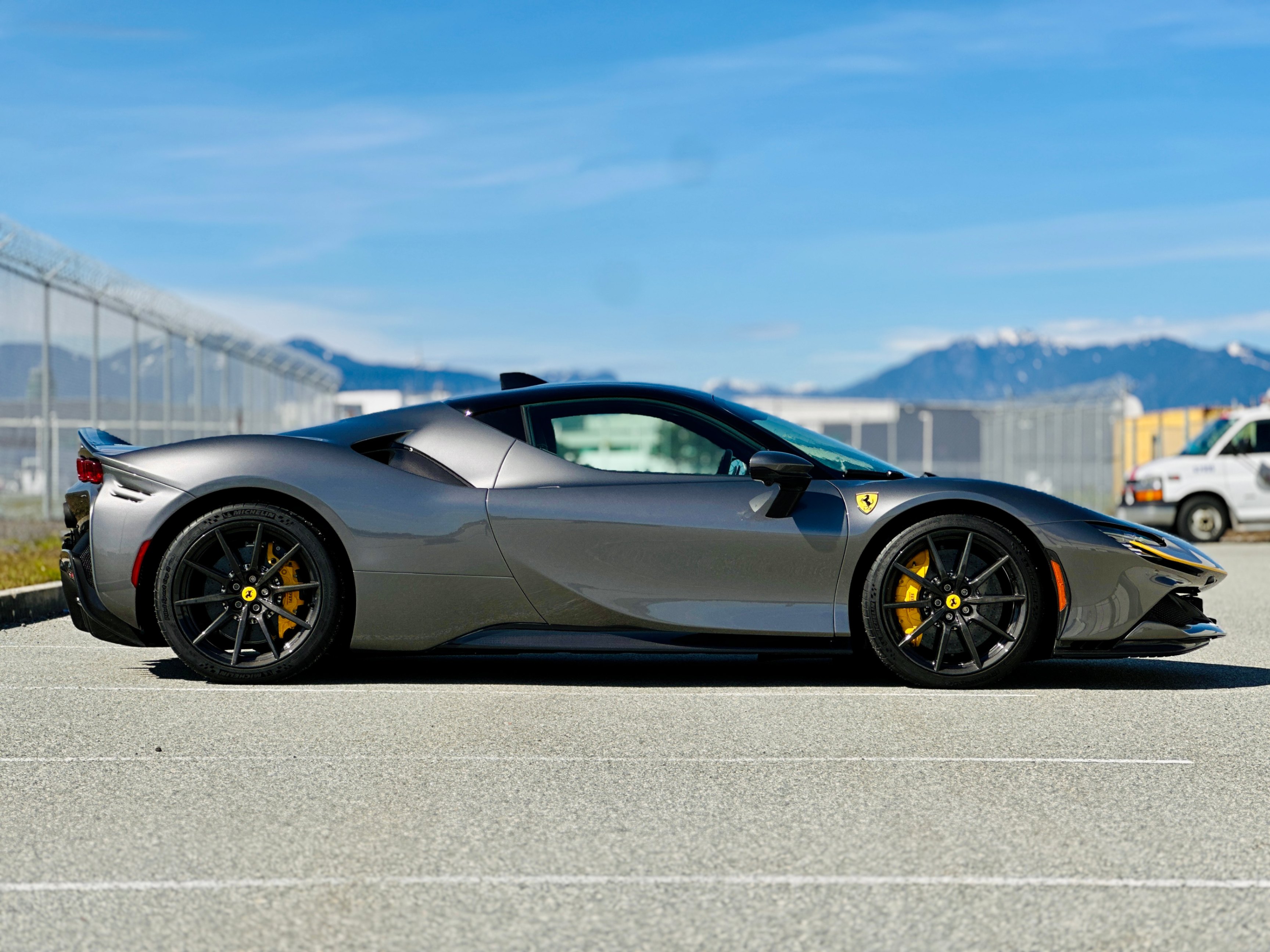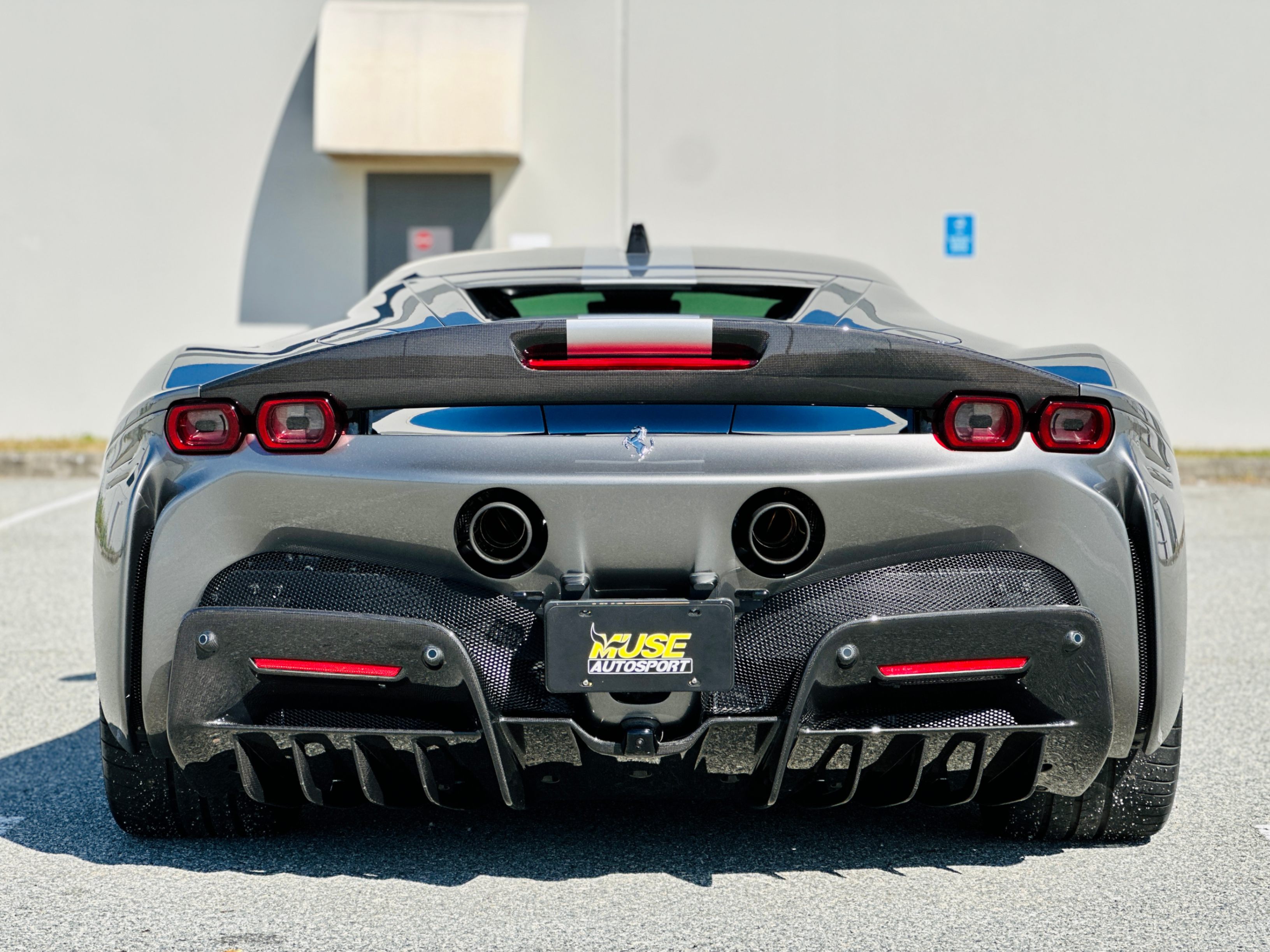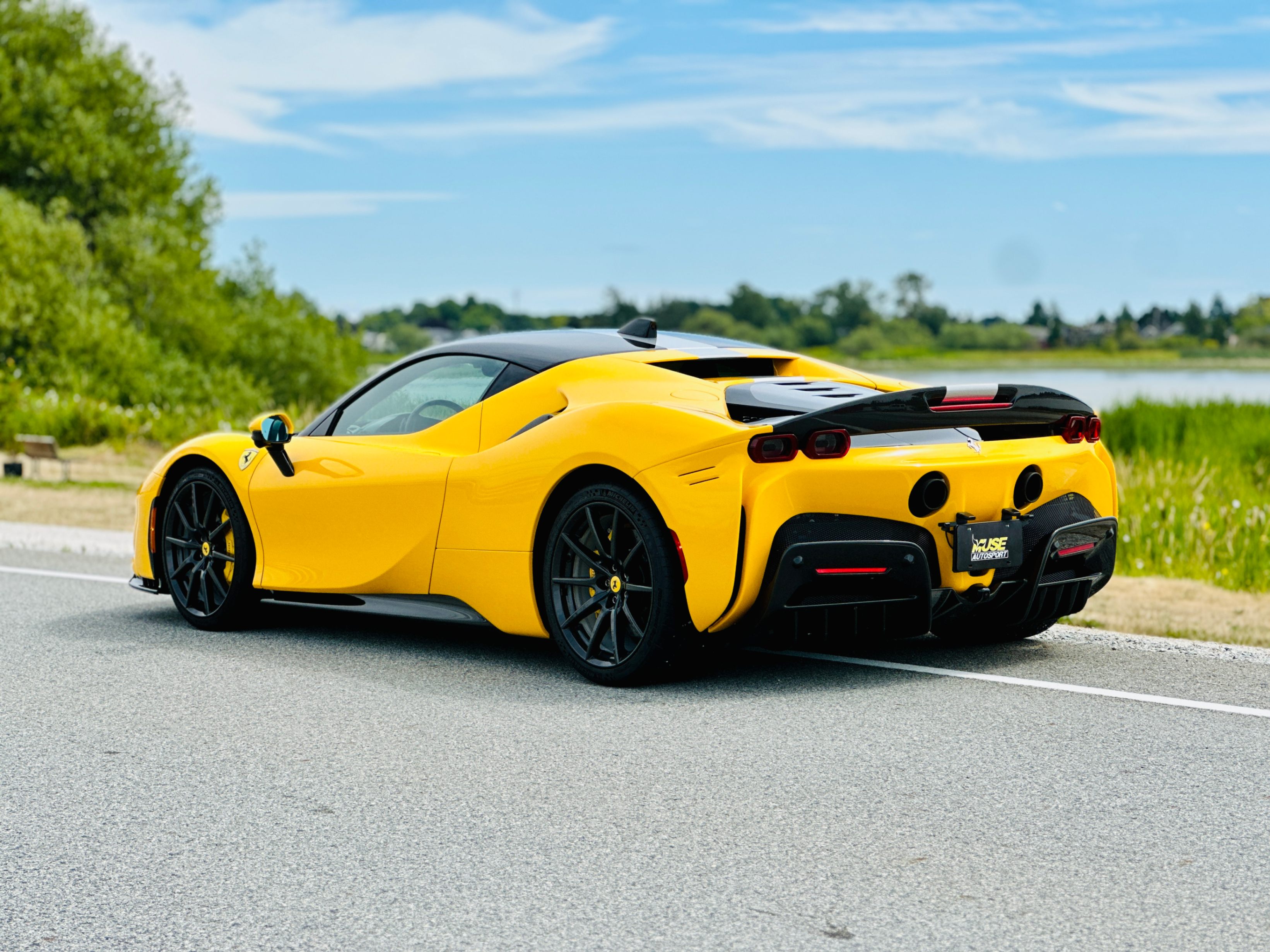 With the SF90, power comes from a massive V-8 and three electric motors. The 4.0-litre twin-turbocharged V-8 generates a mighty 769 horsepower on its own, and the trio of electric motors provide an additional 217 horsepower. In the end, the gas/electric powertrain generates a net output of 986 horsepower and 590 lb-ft of torque. Power is sent to all four wheels, making this the first mid-engined Ferrari with all-wheel drive. An eight-speed automatic transmission oversees the proceedings. As you’d expect, all that power under the hood translates into blistering acceleration. Ferrari estimates that this car will do 0-60 in low two seconds. It has multiple different driving modes which allow you to tailor the car’s handling to suit your preferences. The lineup includes EV Only, Hybrid, Performance, and Qualify, which absolutely unleashes the beast.