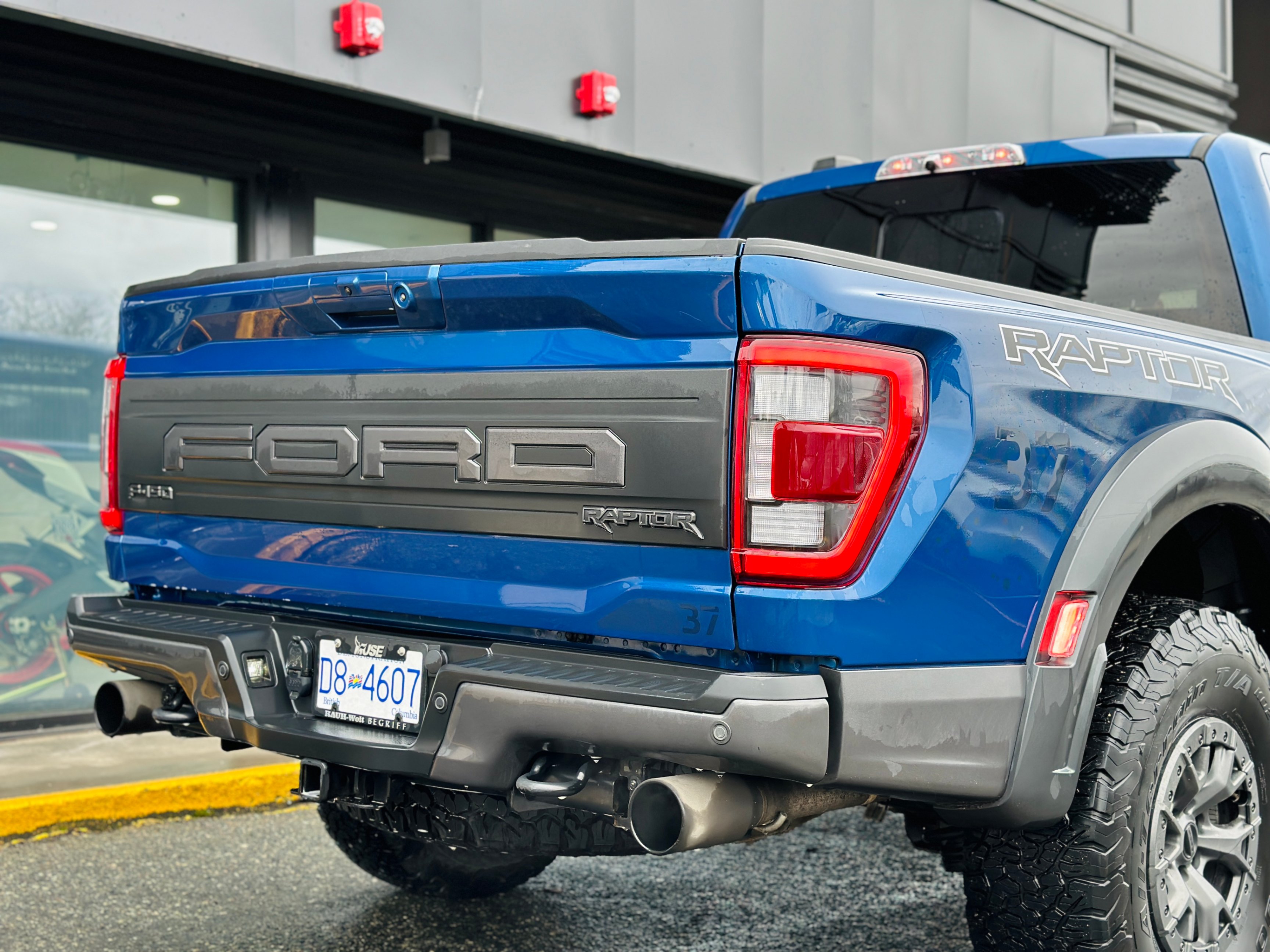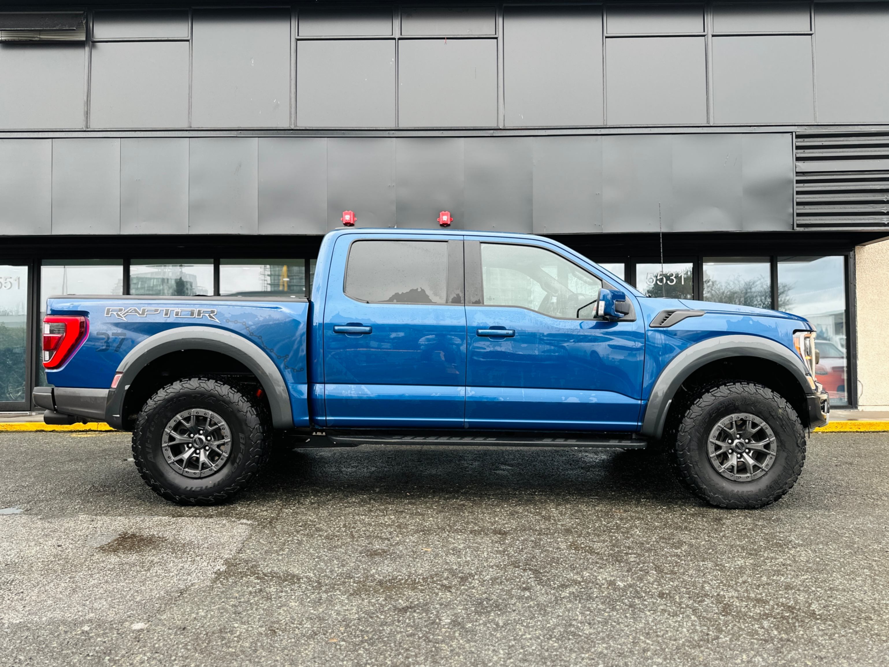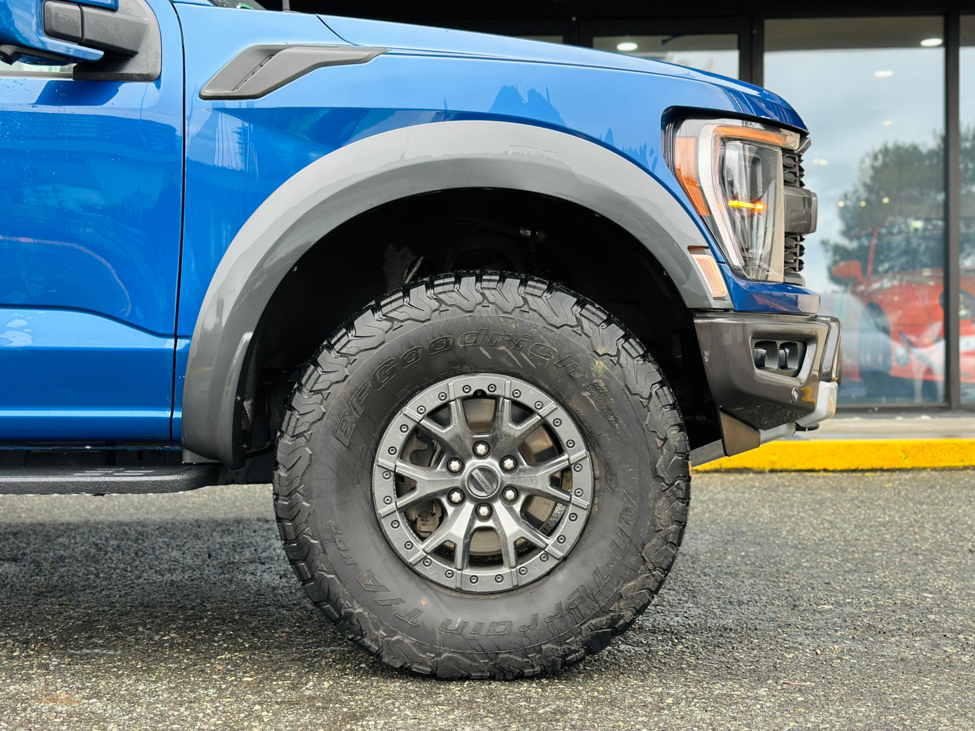 Our 2022 Ford Raptor comes with a factory 37 Performance package, the optional Raptor 37 Performance package brings a set of BFGoodrich All-Terrain T/A KO2 tires measuring—you guessed it—37 inches in diameter. Those bump ground clearance up to 13.1 inches, and approach, departure, and breakover angles to 33.1, 24.9, and 24.4 degrees, respectively. The truck's Fox shock absorbers are retuned accordingly.